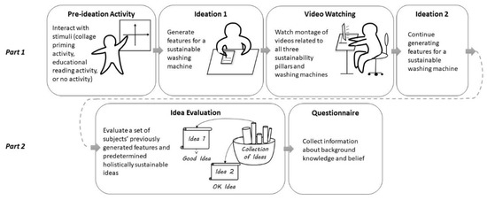 - Video Watching: Participants watched a montage of videos that highlighted the sustainability aspects (user desirability, manufacturing, and environmental friendliness) of washing machines. This step was included to further stimulate design ideas, as described in Section 5.4.