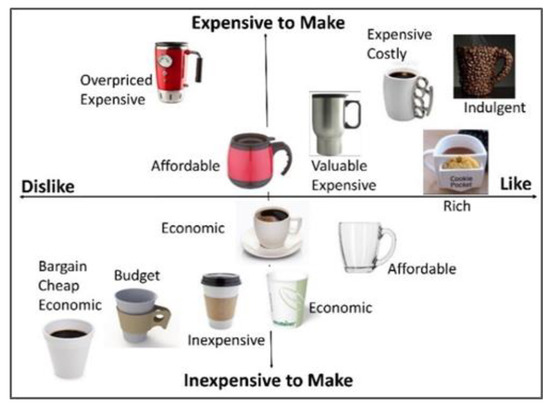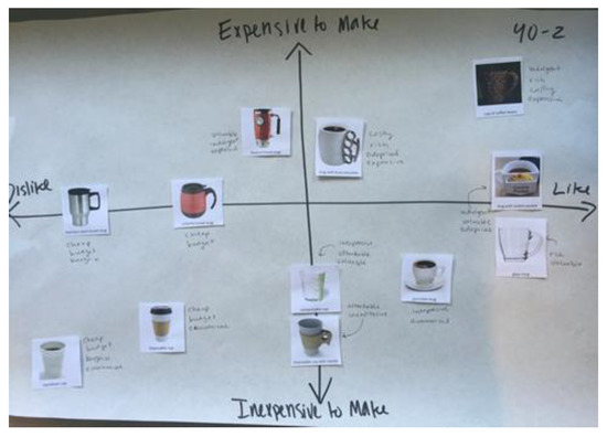 In this activity, participants rated their preference for various types of coffee cups by creating a collage. First, they physically placed product images on a piece of butcher paper that already had a set of labeled axes drawn on it, as illustrated in Figure 3. Second, participants described their selections by choosing words from a list provided and writing these words next to the product images. Each word had to be used at least once, and each cup had to be described by using at least one word.