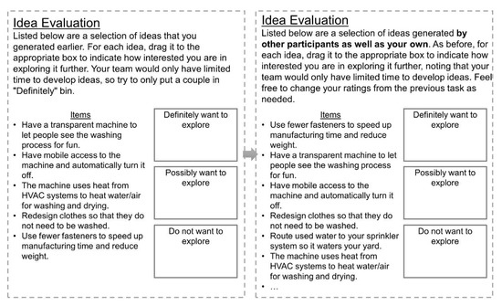 - Idea Evaluation: Participants first evaluated a set of their own design ideas, classifying how interested they were in exploring each idea further. Then, they evaluated a mixed set of ideas, which included the same set of their ideas and a number of predetermined, sustainability-related ideas, presented as coming from other designers. The selection of those ideas and more details are described in Section 5.5. (Note that participants did not rate the relevance of design ideas regarding sustainability; this was performed later by expert judges.)