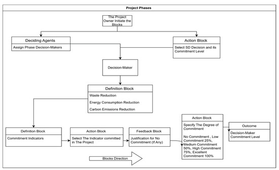 The results of this study informed the development of an SDCTT for tracking the commitment of different project participants within the different phases of projects. The framework of this tool consists of a series of decision blocks defined by its purpose, which are: definition, deciding agent, assessment, action block, and feedback block, inspired by Tapus and Manolache’s study [46]. Figure 2 shows the conceptual framework for developing a sustainable development decisions-tracking tool that integrates the different commitment indicators within different project phases using decision blocks.