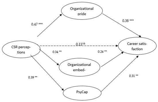 The hypotheses of this study were analyzed using structural equation modeling. All the path coefficients were significant. Employees’ CSR perceptions positively affected career satisfaction (β = 0.563, t = 17.978 p < 0.001), supporting hypothesis 1. Moreover, CSR perceptions were found to positively affect organizational pride (β = 0.464, t = 12.381, p < 0.05), organizational embeddedness (β = 0.386, t = 9.584, p < 0.001), and PsyCap (β = 0.511, t = 14.835, p < 0.001). Career satisfaction positively affected by organizational pride (β = 0.358, t = 8.583, p < 0.05), organizational embeddedness (β = 0.317, t = 7.755, p < 0.05), and PsyCap (β = 0.234, t = 6.926, p < 0.01). Figure 2 showed the path coefficients and hypotheses 3, 4, and 5 were tested. The path values from CSR perceptions to organizational pride (β = 0.47; p < 0.001), from CSR perceptions to organizational embeddedness (β = 0.34; p < 0.01), from CSR perceptions to PsyCap (β = 0.39; p < 0.01), from organizational pride to career satisfaction (β = 0.38; p < 0.001), from organizational embeddedness to career satisfaction (β = 0.26; p < 0.01), and from PsyCap to career satisfaction (β = 0.31; p < 0.01) are significant. Moreover, the path value between CSR perceptions and career satisfaction (β = 0.11; p > 0.05) was not significant, supporting Hypotheses 2–4.