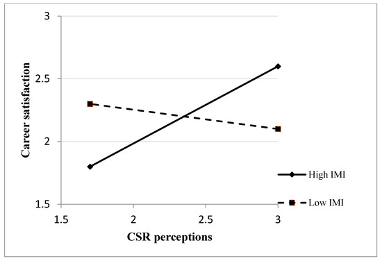 Moral reasoning is more salient for employees with relatively high internalized moral identity. Their emotions of affection, loyalty, trust, and admiration towards the organization are intense. As such, the influence of CSR perceptions on career satisfaction is likely to be amplified for those employees with relatively high than low internalized moral identity [17]. Internalized moral identity helps individuals to view volunteering and pro-social behaviors as part of their self-concept. They tend to feel having more positive psychological resources as a result of the moral values the organization is pursuing through its CSR programs and the self-schemas that one has. Internalized moral identity builds generosity towards others and minimizes social distance towards others, amplifying the positive impact of CSR perceptions on work outcomes such as career satisfaction. Therefore, it is expected that high internalized moral identity would strengthen the effect of CSR perceptions on career satisfaction. Employees high on symbolic moral identity view CSR as a way to reinforce their social or public self. The congruity between organizational CSR values and individual values increases when employees have high moral identity [62]. Symbolic moral identity is also expected to moderate CSR-career satisfaction relationship because the public self is likely to be in harmony with the private self in majority of the cases [19]. More specifically, most of employees are normal in mental health and they integrate their private and public self. It means that those who are high in internalized moral identity are likely to be high in symbolic moral identity [18]. Based on these arguments, we hypothesize: