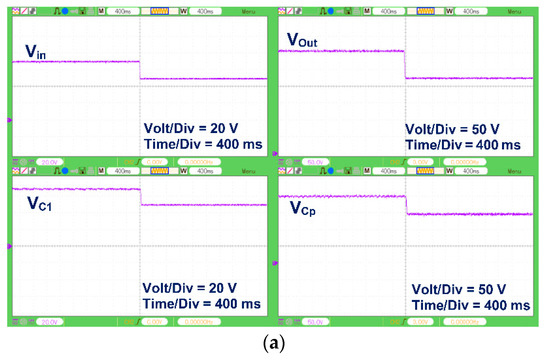 In Figure 11, the converter’s experimental results with and without the feedback control system are shown in the existence of a step-change in the input voltage. Figure 11a presents the results with an open-loop control system. As seen, without having a feed-back system, the output voltage of the converter is suddenly changed from 305 V to 225 V by decreasing the input voltage from 68 V to 50 V. In addition, the voltages across the capacitors C1 and Cp are changed from 68 V to 50 V and from 202 V to 148 V, respectively, by applying the step change. It is clearly seen that the converter’s performance with an open-loop control system is acceptable since its stability is maintained.