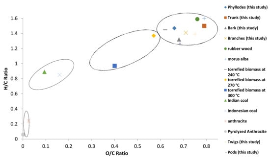 Figure 1 presents the Van-Krevelen diagram of the AM biomass samples used in this study along with the other solid fuels, including wood residues (rubber woods, white mulberry, and black wattle) [52,53], torrefied camphorwood biomass blended with caster cake biomass at 300 °C, 270 °C, and 240 °C [54], coals of different origins [55], and pyrolyzed anthracite and untreated anthracite [55]. The H/C and O/C ratios help to identify the nature and biofuel potential of the fuels as a higher H/C value indicates higher potential. In contrast, a higher O/C value indicates a lower heating value and volatile content in biomass [56]. The ultimate analysis of the samples used in this study was in agreement with the results of different lignocellulosic biomass researched for bioenergy production via thermochemical routes [19,29,38,57,58]. The lower nitrogen and sulfur concentrations were very encouraging from an environmental pollution perspective.