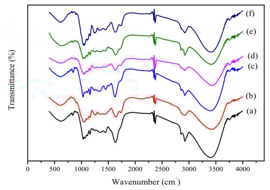 FTIR spectra of (a) phyllodes (b) trunk (c) bark (d) twig, (e) pod, and (f) branch biomass samples.