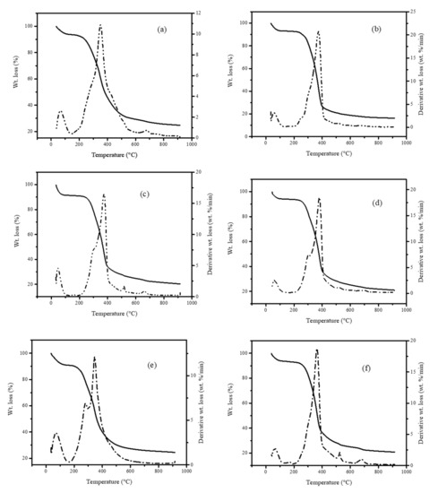TGA and DTG curves of (a) phyllodes (b) trunk (c) bark (d) twigs, (e) pods, and (f) branch biomass under the pyrolytic degradation.