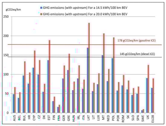 GHG emissions due to the use of electric vehicles in the European Union, calculated by using C-intensity data for electricity from IEA for the year 2013. Source: [11] 1361-9209/© 2017 The Authors. Published by Elsevier Ltd. This is an open access article under the CC BY license (http://creativecommons.org/licenses/BY/4.0/ (accessed on 20 April 2020)).