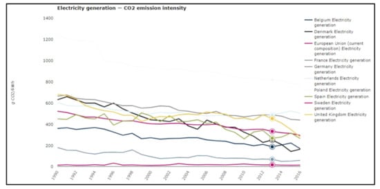 Carbon intensities (power plants gate-to-gate) within the EU for the period 1990–2016 [27].