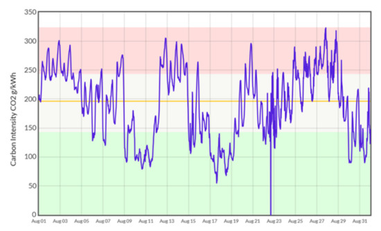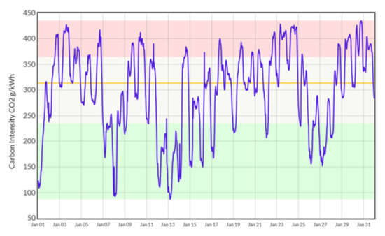 As an example, data on predicted carbon intensity of electricity for the UK [28] are shown in Figure 4.