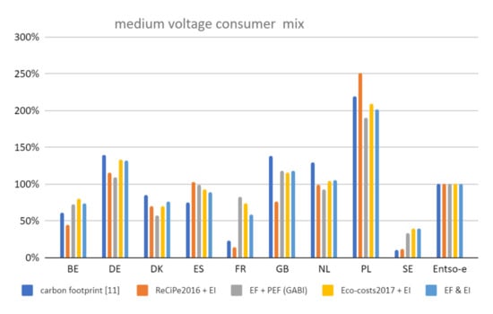 In LCAs for BEVs and hydrogen produced by electrolysis, electricity has a dominant contribution [1,4,5,6], not only in the use-phase, but also in the production of the materials. The percentage of CO2 emissions from electricity for metals production (Ecoinvent V3.5, “cut-off” database) is in the range of 30–56% (e.g., Aluminum 56%, Copper 35%, Gold 36%, Lead 30%, Nickel 31%, Silver 52%, Zinc 50%). For woven textile (Polyester, 70 dTex) the percentage is higher (70–80%). For BEVs, electrolytic hydrogen, and other products like household appliances such as washing machines, vacuum cleaners, and flat irons, the choice of data for electricity is therefore highly relevant. Common practice in LCA for household appliances is that the European average consumption mix is applied (reasoning: these appliances are used all over Europe), except for specific cases (ex-post LCA) where predominantly the country consumption mix data are taken. An analysis of 38 papers on LCAs of washing machines (search in Scopus on ‘LCA washing machine’) revealed that in more than 80% of the papers the origin of the electricity was not specified, which suggests that the author was not aware of the big differences in data on electricity.