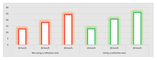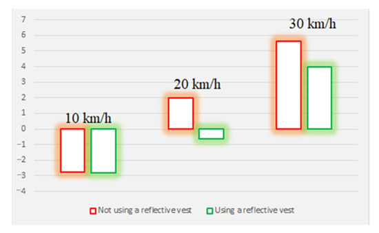The mean errors (deviations from the actual e-bicycle speed) in the estimation of the e-bicycle speed are shown in Figure 3. It can be seen that the mean error is lower when the respondents observed the e-bicyclist using a reflective vest in the situation when the e-bicycle travelled at the speeds of 20 and 30 km/h (Table 3).