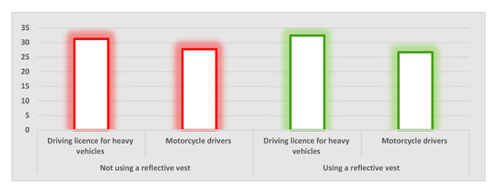 Furthermore, the results show that there are statistically significant differences between the drivers possessing different driving licence categories for the 30 km/h speed (when the e-bicyclist wears a reflective vest (F = 2.554; p = 0.041) and when the e-bicyclist does not wear a reflective vest (F = 2.493; p = 0.045)). Heavy vehicle drivers perceive the e-bicycle speed with the smallest error (when the e-bicyclist does not use a reflective vest (M = 31.22) and when the e-bicyclist uses a reflective vest (M = 32.39)). Motorcycle drivers estimate the e-bicycle speed with the largest error (when the e-bicyclist does not use a reflective vest (M = 27.67) and when the e-bicyclist uses a reflective vest (M = 26.67)). The study results indicate that professional drivers (probably due to their experience of driving at a wide range of speeds) estimate the e-bicycle speed more accurately than other driver categories. On the other hand, motorcycle drivers (as one of the most endangered categories of traffic participants) estimate the e-bicycle speed least accurately, so this participant category should be particularly focused on and educated. This result can be connected with the results of study [41] stating that motorcycle drivers drive faster, on average, than passenger car drivers and that extreme speeding is recorded 2.3 times more often by motorcyclists than by passenger car drivers, which can be the reason for the incorrect perception of the e-bicycle speed. Therefore, errors in the perception of the e-bicycle speed can occur due to the motorcyclists “not being accustomed” to the e-bicycle speed.