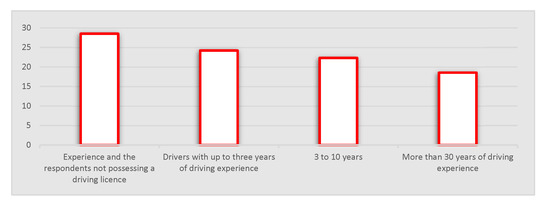 The results of the One-Way ANOVA analysis show statistically significant differences in 30 km/h speed (F = 2.477; p = 0.046) estimations for drivers with different driving experience when the e-bicyclist does not wear a reflective vest. The participants who did not possess a driving licence made the least error in speed estimation (M = 28.5), while the drivers with more than 30 years of driving experience show the worst estimation (M = 18.53). It can be seen that the mean error in the speed estimation increases with driving experience of the respondents (Figure 5).