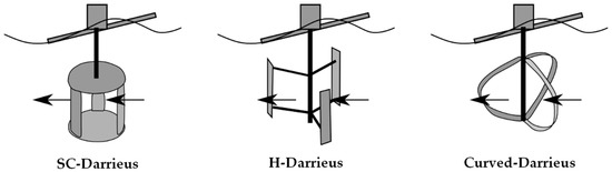 Hydrokinetic turbines can be classified into two large groups depending on the direction of the flow and the axis of rotation: axial turbines (flow and axis are parallel) and crossflow turbines (flow and axis are perpendicular). Nowadays, crossflow turbines are those that generate more interest [11]. This is mainly because these rotors, although not as efficient as axial ones, have a much simpler mechanical coupling system that reduces the construction costs and facilitates installation and maintenance activities [12]. One of the most frequently used crossflow rotor designs is Darrieus type with different configurations: Squirrel Cage (SC), H, and curved [13] (Figure 2). These designs are based on aerodynamical profiles used in the wind industry [14].