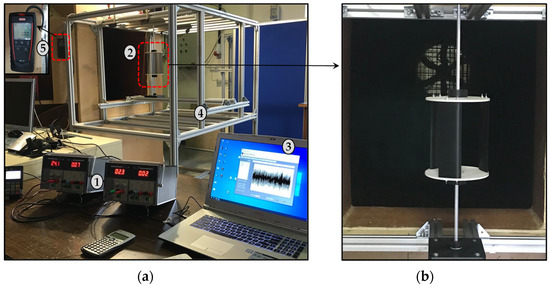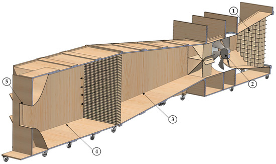 The characteristics of the wind tunnel are shown in Figure 6, where (1) is the honeycomb panels controlling admission, (2) is the axial fan, (3) is the diffuser section, (4) is the stilling chamber, and (5) is the testing section.