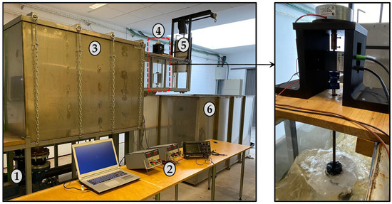 The description of the water flume is shown in Figure 8, where (1) is the hydraulic pumps, (2) is the electronic system, (3) is the reassuring tank, (4) is the channel test section including torque sensor and rotor, (5) is the water gate, and (6) is the suction tank.
