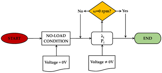 This device allows for measurements of torque, rotational speeds, and relative position of the blades with data-taking frequencies up to 80 data per second, thereby collecting a good range of sampling. All collected data were sent to a database for further processing. The variation in the braking force was directly controlled by a power supply device. The characterization procedure (Figure 9) started with an initial measurement where no braking force was applied, so the rotor had its maximum rotational speed but did not generate power.