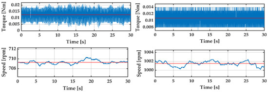During the different tests, continuous measurements of the parameters, including torque and angular velocity, were carried out. Thus, it was possible to check if the turbine reached stability before starting the power test in each point, thereby minimizing discontinuities. After loading the turbine rotor, it proved preferable to wait and watch the rotational speed variation of the turbine rotor before recording the results to ensure that the turbine was working under stable conditions. Figure 10 illustrates the stability condition during one of the proposed tests.