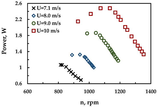 The variation in the power output with the rotational speed of the turbine rotor for different upstream wind velocities are shown in Figure 11. All tested speeds show the same tendency. When loading the turbine rotor, the rotational speed decreased and the output power increased dramatically until reaching the maximum power point. After that, the power output started to decline up until it reached the point where the turbine stopped and was not able to produce more power. In fact, for high flow velocities, the power curve was almost complete after reaching the MPP, but for low velocities, the power curve nearly reached the MPP and does not reach the completion point. This is due to the power-to-friction ratio, since for high flow velocity, the turbine is able to produce power to overcome the friction and to pass the MPP. On the other hand, for low velocities, the rotor is not able to pass this point and to characterize this part of the power curve.