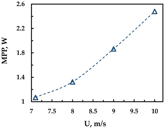 By tracking the maximum power point MPP variation with the upstream wind velocity (Figure 12), it was found that the maximum power increases approximately with the cube of the upstream wind velocity, as Equation (3) indicates, to reach its maximum value of 2.5 W at a wind velocity of 10 m/s.
