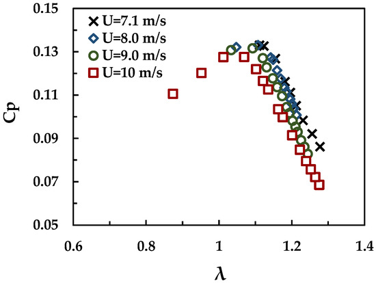 The characteristic curve of the turbine inside the wind tunnel is shown in Figure 13. The rotor is observed as working in a stable range of approximately 0.13, this being the maximum point reached at a of 1.1. Additionally, all curves seem to be identical, which means that the turbine rotor works properly under open-field conditions without the existence of other factor such as blockage. In fact, the value of tip speed ratio is considered paltry compared with other similar turbines; this is due to the high solidity value that was selected in the proposed rotor to allow for self-starting under low flow velocities.