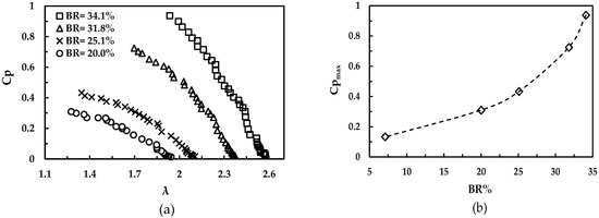 To study the effects of blockage conditions and their correction to open-field behavior, the turbine was tested in the open-surface water flume. Four tests were carried out for similar velocities and different blockage values ranging from 0.2 to 0.34. Figure 14a shows the variation in the characteristic curves with blockage. Different curves were obtained for the same rotor, while for wind tests, only one curve was drawn. This is due to the existence of flow blockage conditions that affect the rotor performance. By increasing the blockage value, the performance curves shifted to higher values of tip speed ratios and power coefficients. This is a direct consequence of the flow acceleration around the turbine rotor while the blockage increased. As shown in Figure 14b, with a turbine rotor blockage value of 6.8% inside the wind tunnel, which is considered an open-field condition, the maximum power coefficient value is of 0.13. By increasing the blockage value from 6.8% to 34.1%, the maximum power coefficient increased to reach its maximum value of 0.97.