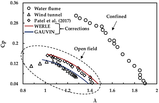 The extrapolation of blockage to open-field conditions was performed using the flow velocity of 0.71 m/s with a of 0.2. Under these conditions, the rotor works at Reynolds number of 3.5 × 104 approximately, so that results between wind and water can be compared. After applying the formulation of Gauvin et al. and Werle, the of 0.92 m/s and 0.875 m/s were extracted, respectively. Figure 15 compares the results: obtained at wind tunnel, confined water flume, and calculated for an open field (open waters) with the blockage corrections (Werle and Gauvin) and with the results of the experiments carried out by Patel et al. [45] using the same profile and solidity in open waters.