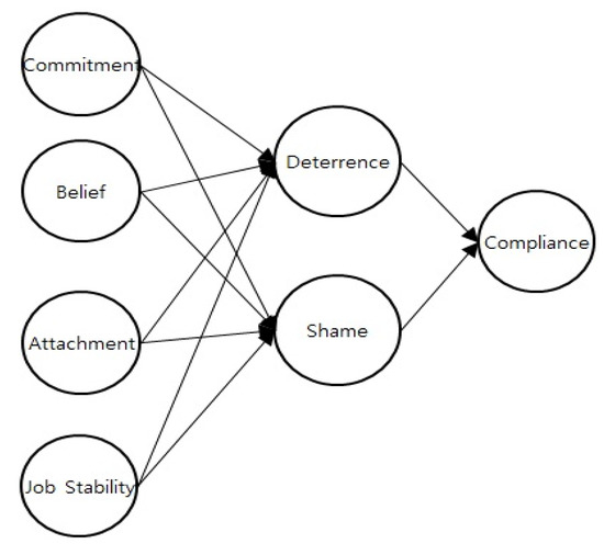 In this regard, four constructs are selected as critically influencers of deterrence and shame related to ISS: commitment, belief, attachment and job stability. Commitment, belief and attachment are adapted from SBT, while job stability is adapted from ASBT. The involvement element is excluded from this study of SBT and ASBT, for the reason already explained, that it is closely related to commitment. These two are not orthogonal in terms of forming social bonds.