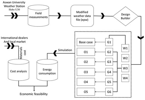 The study investigated the effects of using nano vacuum insulation panels and polystyrene foam in external walls, as well as different types of nano glazing in windows. The main objective of the present study was to investigate the use of these nanomaterials integrated into building components like walls and windows as a new approach to building insulation in New Aswan City under the current climatic conditions. The analysis went through three main steps in this respect. The first step dealt with the impact of materials used in walls on the energy consumption in social residential buildings. The second phase explored the influence of nano-glazing materials on energy consumption of the examined buildings. The third step involved integration of the two steps described above. The analysis was expanded to include their economic feasibility for Egyptian cities. Figure 1 shows the steps of the study which investigates four types of walls (W1, W2, W3 and W4), six types of glazing (G1–G6), and five integrated options (O1–O5) between the studied walls and glazing. Table 1 and Table 2 show the characteristics of the studied walls and glazing.
