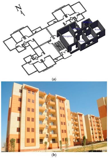 A model of a real residential building located in New Aswan City was used as shown in Figure 3. The building located within the social housing project was selected owing to its construction that utilized low-cost methods without consideration for climatic aspects. The building has six floors (four flats per floor) and an area of approximately 86 m2 per flat, and about 357 m2 for the whole building including the stair space. The floor height was 3 m, and the window-to-wall ratio was about 10%.