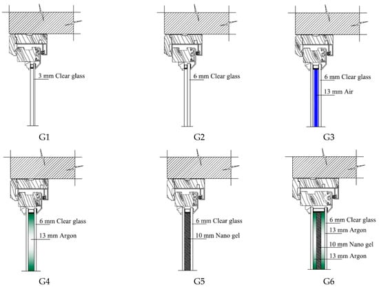 In the wall sections shown in Figure 4, W1 and W2 refer to the popularly used construction systems. W3 depicts the use of conventional insulation materials while W4 depicts the use of nanomaterial-based insulation. In the window cross-sections shown in Figure 5, G1 and G2 are the common windows used, whereas G3, G4, G5 and G6 are the various categories of insulated windows.