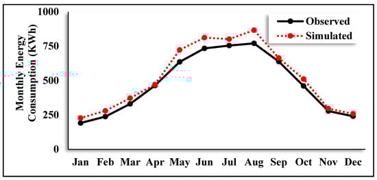 According to ASHRAE Guideline 14-2002, the simulation results were calibrated through modelling of the required parameters of the study site (i.e., comfort zone limits, lighting, building materials and heating, ventilation and air conditioning (HVAC) configurations). The electricity bills of the flat located on the third floor were used to compare the simulation results and actual energy consumption to represent the average power consumption of all the flats of the building. The average error of energy simulation results was found to be 10.19% (Figure 7), whereas the correlation coefficient between simulated and actual observed values was 0.995.