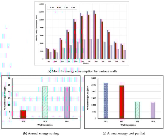 The annual energy consumption, annual energy costs and annual energy savings of the building with various insulation walls are shown in Figure 8a–c. All three variables were sharply reduced using insulation wall-based- polystyrene foam (W3) and nano VIPs (W4) as compared to the commonly used walls in the building model (W1 and W2). It was also observed that approximately 23% of the energy was saved in the case of wall-based- PS foam and nano VIPs and the same annual energy consumption and savings in annual energy cost in both cases were obtained.