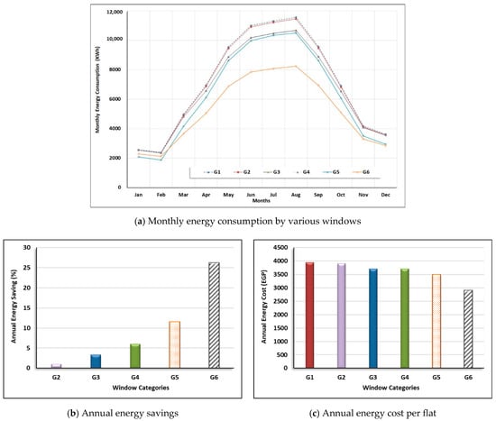The simulation results for the various windows are shown in Figure 9a–c. The (G6) window (with nanogel and argon layers) gave the best results compared to other types of windows in terms of annual energy consumption, annual energy costs and annual energy savings. This window saved about 26% of annual energy relative to that of the (G1) window. The (G5) window (nanogel layer) showed about 11% saving in annual energy consumption. This percentage is higher than the value for the double-glazed window with air (G3) or argon (G4) layer in between the glass, achieving approximately, respectively, 3% and 5% savings in the annual energy consumption. The (G2) window (with thickened glass) had a minimal effect as only 1% on the energy was saved relative to the base case (G1). The high thermal insulation of nanogel based widows could be attributed to the low thermal conductivity of the nanogel as compared to argon or air. In addition, nanogel reduced airflow through small pores. The embedded air inside the nanopores led to a reduction in its thermal conductivity compared to free air at ambient pressure due to the condensed effect within the nanopores of nanogel [39].