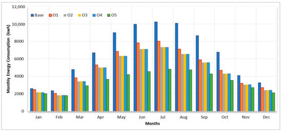 - (O3) and (O4) showed almost the same impact as (O2). They contributed to an improvement in terms of energy efficiency with 30.3%, and 30.4%, respectively, in comparison with the base case.