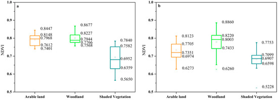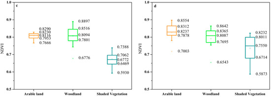 NDVI distributions of arable land, woodland, and shaded vegetation in the Landsat images in the year 1990 (a), 2000 (b), 2010 (c), and 2020 (d). The three land use/cover types were visually interpreted from the randomly selected Landsat images with the aid of Google Earth Pro images. Each box plot explains the location of the 0th, 25th, 50th, 75th, and 100th percentiles using horizontal lines (boxes and whiskers).