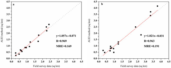 where is the ith area obtained from field survey, is the ith area from ALEI method, and is 15, the total number of the field survey locations.