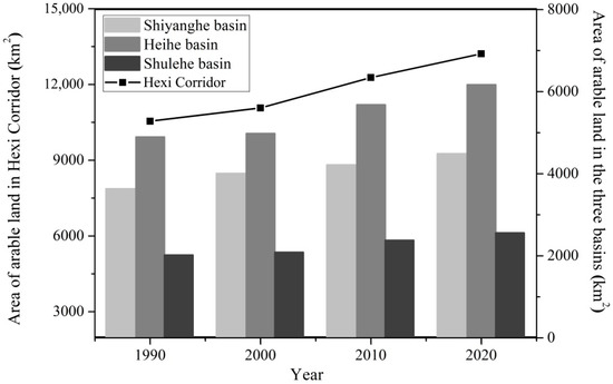 Oasis change in the Hexi Corridor during 1990–2020. The black, block line shows the change trend of arable land area, and the bars indicate the arable land area of the Shiyanghe, Heihe, and Shulehe inland river basins.