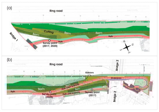 Plan view of the project zone between Bridge 1 and Bridge 2, with indication of the position of the berms added to the original slope and the gabion wall near the underpass below Bridge 2. In (a), the zone near Bridge 1 is shown, in (b) the zone near Bridge 2, including the new and old branch of the path. The points where the surveys were taken in 2017 (before the intervention) and 2020 (post operam) are shown on the maps.