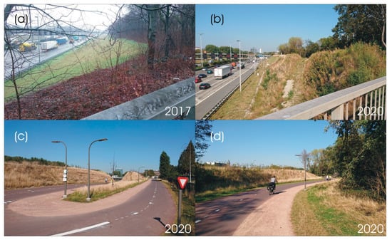 Photographs taken before and after the intervention. In (a), the grass-covered embankment bordering the ring road is shown, together with the tall vegetation near its top (2017). In (b), a view on the berm added to the slope is provided, including the cutting in the berm (2020). Photographs (a,b) were both taken from Bridge 1. In (c), the crossing between the old and new branch of the cycling path towards Bridge 2 is shown, including the survey position in 2020. Picture (d) shows the survey position near Bridge 1 in 2020.