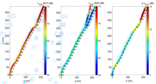Spatial distribution (plan view) of the sound pressure levels measured along the cycling/walking path in the project zone, using the LA50 indicator during daytime hours in the weeks when the questionnaires were held. On the left and middle panel, data during the 2017 and 2020 campaign is shown, on the right panel the difference in LA50 at corresponding locations (at the new branch running towards the underpass, only absolute levels can be shown). Distances are referenced to the bottom left position in graphs (x,y) = (0,0).