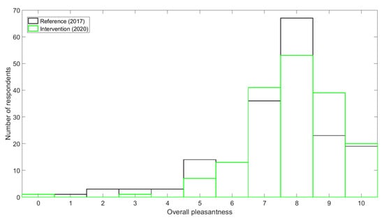 Histograms of overall pleasantness during the passage through the project zone (with 0 = “very unpleasant”, and 10 = “very pleasant”).