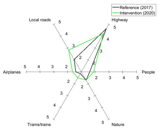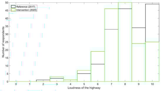 The loudness of the highway (See Figure 5), on an 11-point scale, reduced from M = 8.2 (SD = 1.6) to M = 7.7 (SD = 1.5) due to the intervention. Especially the highest classes (“9” and “10”) became less populated in 2020. In 2017, these classes were responsible for almost half of the answers (46%). After the intervention, they reduced to about one quarter (27%). Clearly, an exposure level near 65 dBA along the cycling/walking path is still high and the loudness evaluation consequently ends up near the higher end of the range.