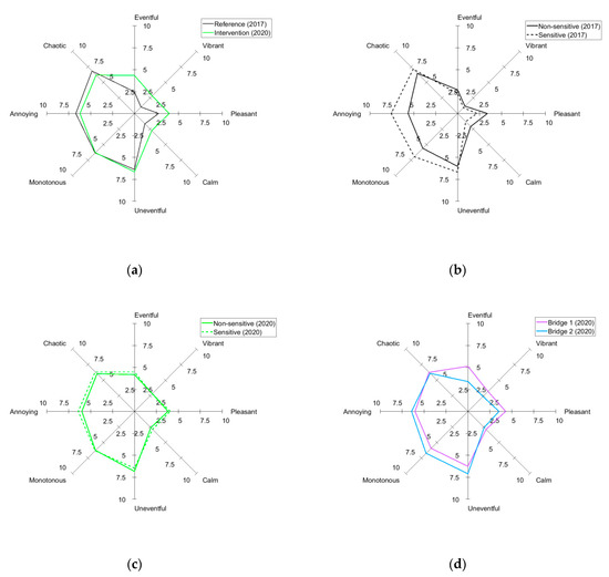 Spider plots showing the average evaluations on the soundscape dimensions following the circumplex model (with 0 = “not at all”, and 10 = “completely”). In (a), the reference survey in 2017 is compared to the survey post operam in 2020. In (b,c), less-than-average (“non-sensitive”) and more-than-average noise sensitive persons (“sensitive”) are pooled, for each survey separately. In (d), the 2020 data are pooled for participants surveyed either near Bridge 1 or Bridge 2.