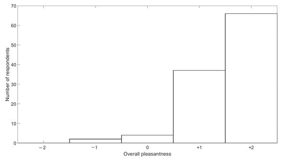 Note that “pleasantness” here is opposed to “annoying”, evaluated purely from an acoustic point of view. This contrasts to the “overall” experience/pleasantness discussed in Section 3.2.1, also including other aspects of how the environment is perceived.