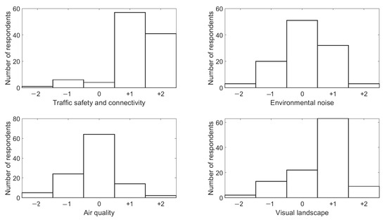 Histogram of the overall change in traffic safety and connectivity, environmental noise, air quality, and the visual landscape, as perceived by respondents familiar with the situation before the intervention took place (with “−2” = very negative effect, “0” = no effect, and “+2” = very positive effect).