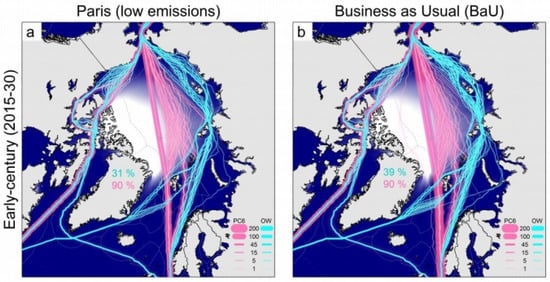 Anticipated September Sea Routes through the Arctic (2015–30) based on scenarios of low emissions and a continuation of current trends; (a) the low emissions scenario under the Paris Accord; (b) does nothing, the Arctic ice cap is still going to melt sufficiently for marine traffic to increase. Source: [9].