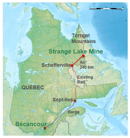 The Strange Lake rare earths deposit is an example of a mine location that is uneconomic to reach by ground transport [42,43]. Figure 5 illustrates the site of Strange Lake in Northern Quebec that lies 240 km (km) north of the closest railway line, through rough terrain, river crossings, muskeg and permafrost soils. The mine developer, Torngat Metals, cannot raise $720 million ($3 million/km) to build a gravel road access to move 200,000 tons of rare earth ore concentrate annually for delivery to the rail head at Schefferville. From Schefferville the concentrate is to be moved by rail to Sept-Iles where it will be trans-shipped to barges for transport to Becancour for further refining. Finally, the output will be transported to Norway for final production.