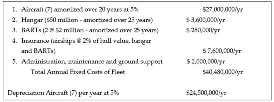 The fixed costs for a fleet of seven airships, two BARTs and one hangar are presented in Figure 8. The hangar needs to be available in order to undertake major repairs and to conduct inspections. It might be located at the transshipment site (Schefferville) or closer to Becancour (Montreal) where the airships would be originally assembled. The estimated cost of the airship hangar is $50 million. The airships are amortized over 20 years while the fixed facilities are expensed over 25 years. The total annual cost to operate the fleet is $40,480,000 and the depreciation on the aircraft is $24,500,000.