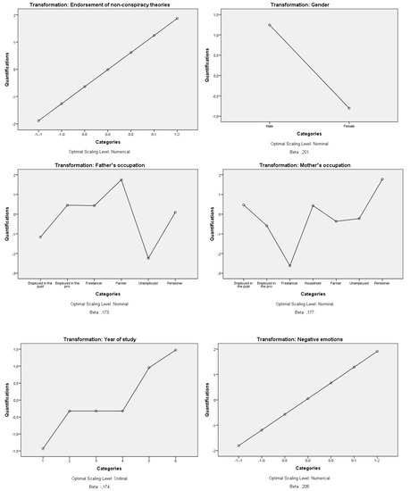 The application of categorical regression gave coefficient value of multiple determination R2 = 0.504 and και F = 2.211, and it is statistically important. The standardized (regression) coefficients of the independent variables indicate that the “endorsement of non-conspiracy theories” is mostly affected by the variables: negative emotions, gender and information sources about the pandemic. In addition, the F values of each independent variable show that the removal of variables with high F values make the subsample weak. However, the removal of the variable “satisfaction with the state of the environment” has only a negligible effect on the predictability of the subsample. Moreover, the measures of relevant importance of the independent variables suggest that the independent variables of “information sources about the pandemic” (19%) followed by “negative emotions” (16%) and “accumulated negative emotions” (14.3%) made the greatest contribution to the dependent variable. With regard to variables’ transformation diagrams (Figure 1) and the signs of the standardized coefficient, it can be concluded that non-conspiracy theories are endorsed by individuals who: